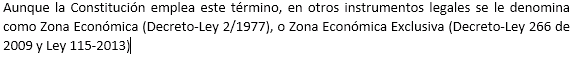 En el ordenamiento jurídico cubano, el Artículo 11 de la Constitución de laRepública define que el territorio nacional se extiende en superficie hasta ellímite exterior del mar territorial, proclamando sus facultades, tanto en elterritorio nacional como en relación con los recursos naturales en las aguas, ellecho y el subsuelo de la Zona Económica Marítima3 conforme a la prácticainternacional. Además, como estado parte de CONVEMAR, Cuba tieneestablecidos por medio de varios Decretos-Leyes los límites geográficos y lasfacultades ejercidas en sus zonas marítimas, siendo estos: el Decreto-Ley No.1de 1977 (del Mar Territorial), el Decreto-Ley No. 2 de 1977 y el Decreto-Ley No.266 de 2009 (sobre la ZEE), y el Decreto-Ley 158 de 1995 (de la ZonaContigua) (Cuba, Consejo de Estado).