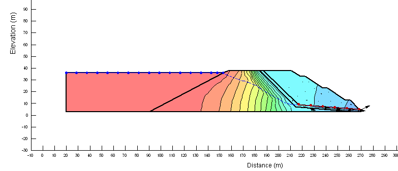 En la figura 1 (a-b) se observa cómo la línea de corriente superior (nivel freático) atraviesa la laterita, la cola y descarga en el punto inferior de la capa filtrante de arena, el flujo de infiltración está en la zona saturada y las presiones de agua disminuyen. Con la ayuda de SEEP/W se determinó la línea piezométrica que se requirió para la modelación de la estabilidad de los taludes con el SLOPE/W, lo que garantiza taludes estables y seguros.