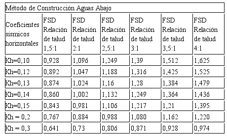 Como el valor promedio de coeficiente sísmico horizontal para la zona estudiada es kh=0.13; por tanto, analizando la Tabla 2, los taludes de esta presa deben tener pendiente de 2.5:1 o mayor, para asegurar su estabilidad para este coeficiente sísmico. Las relaciones de taludes 2.5:1 y 3:1 son inestables para Kh entre 0.2 y 0.3; sin embargo, para valores de kh = 0.3 ninguna relación de talud será estable ante evento sísmico.
