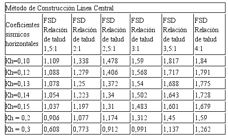 La tabla 3 muestra los resultados de factores de seguridad ante acciones dinámicas para la variante método de construcción línea central. La relación de talud 1.5:1 es la más desfavorable, pues para todos los coeficientes sísmicos horizontales analizados el factor de seguridad dinámico es menor que 1, valor límite del Fs a considerar para asegurar estabilidad.