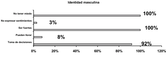 El 69 % significa que solo ellos manejan los recursos de la familia; en cambio, el 80 % admite que prefiere el apoyo económico de su pareja, al considerar que es bueno que se cuente con mayor economía en el hogar. Sin embargo, consideran que si se quedaran sin empleo corren el riesgos de perder su masculinidad2, que la mujer siempre tiene que ser “apoyo” en la familia por el papel preponderante que estas desempeñan, lo que a su vez significa la invisibilidad de las féminas si se analiza desde una perspectiva sociológica. Se mantienen disonancias entre el discurso y la práctica en el desempeño de los roles de género en las familias. El 63 % refiere que participa en el trabajo doméstico, aunque plantean estar seguros de que este es una labor para mujeres (98 %). La figura 3 muestra las consideraciones de actoresinvestigados acerca de su identidad masculina.