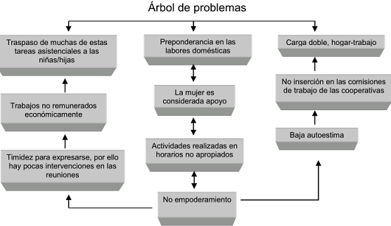 El taller se clausuró con una lluvia de ideas sobre la siguiente pregunta: ¿Qué limitaciones tienen las mujeres para la participación en los espacios públicos de la cooperativa? Con las respuestas aportadas se organizó el árbol de problemas que se expone a continuación: (figura 4)