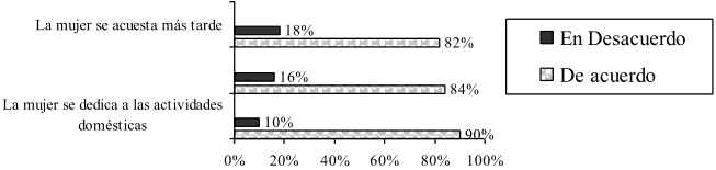 A través del análisis realizado, se reconoció la limitación de la mujer por parte de los hombres. El 90 % de los investigados refirió que estas se dedican a las actividades domésticas, mientras que el 84 % expresó que tienen que levantarse más temprano y el 82 % coincidió en que deben acostarse más tarde.