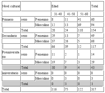 Las mujeres abarcadas por el estudio mayoritariamente poseen un nivel cultural secundario y una edad que oscila entre los 51 y 60 años. La población masculina quedó conformada fundamentalmente por graduados de la enseñanza primaria, predominó la misma edad que en el sexo femenino.