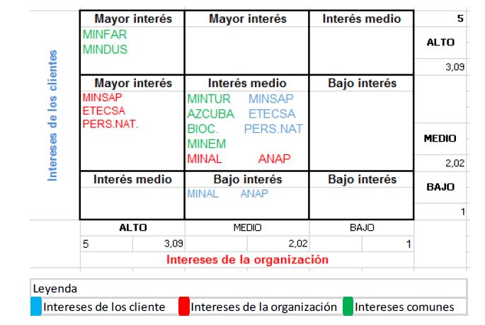 Se confecciona una matriz de intereses a partir de segmentar el mercado, teniendo en cuenta los intereses de los clientes y de la organización. En color azul se aprecian los intereses del cliente, en color rojo aparecen los intereses de la organización y en color verde se consideran los intereses, comunes como se muestra en la Figura 1.