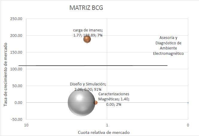 De acuerdo con la estadística, el servicio de Asesoría y Diagnóstico de Ambiente Electromagnético no está definido en ningún cuadrante, pero se sugiere ubicarlo en el cuadrante Incógnita, teniendo en cuenta que es un producto que debe introducirse en el mercado, de alto valor agregado, que tiene potencial para convertirse en el producto estrella de los servicios del laboratorio.
