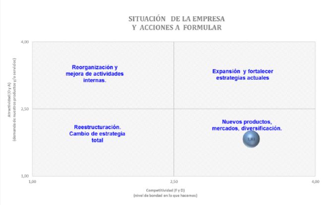 En la figura 3 se puede observar el resultado de la aplicación de la Matriz DAFO. El laboratorio está situado en una posición en la que se hace necesario realizar acciones que tributen a diversificar la oferta de sus servicios, penetrar en el mercado y desarrollar nuevos productos. Dichas acciones deben orientarse, además, a contrarrestar las debilidades, de manera que se puedan convertir en fortalezas para el área objeto de estudio y posibilitar el aprovechamiento de las oportunidades del entorno con mayor eficacia. Teniendo esto en cuenta, se debe realizar un proceso de capacitación y periódica evaluación del capital humano para aumentar la disponibilidad de personal para la prestación del servicio, y para proporcionarles a los trabajadores relacionados con la actividad comercial los conocimientos técnicos y especializados que mejoren su desempeño en la promoción y venta de los servicios. También, para enfrentar mejor a la competencia, se necesita acreditar al laboratorio, así como implementar el Sistema de Gestión de la Calidad.