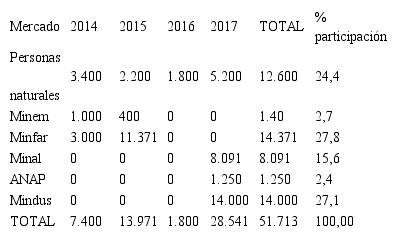 El análisis se enmarcó en la identificación de los segmentos de mercado hacia los cuales se han dirigido los servicios del Laboratorio de Caracterizaciones Magnéticas, en el período comprendido entre los años 2014 y 2017. Este diagnóstico permitió conocer, atendiendo al porcentaje de participación en las ventas del período, que la demanda se concentra fundamentalmente en los ministerios Minfar, Mindus y en las personas naturales, como se muestra en la siguiente tabla. Los valores se muestran en CUP.(ver Tabla 1.)