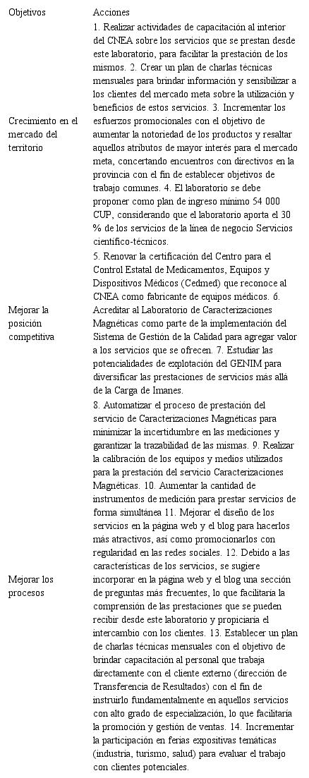 El plan de acciones elaborado permite mejorar la comercialización de los Servicios del Laboratorio de Caracterizaciones Magnéticas y sirven de base para la toma de decisiones en cuanto a la proyección del CNEA de cara al mercado de los Servicios Científico-técnicos.