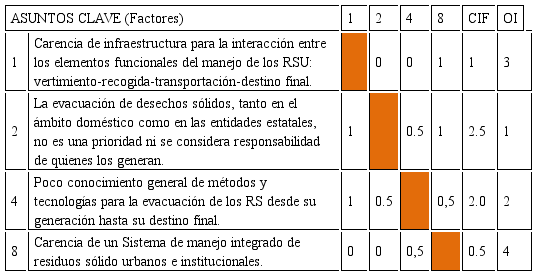 Mediante la aplicación de una matriz multicriterio se determinaron los asuntos clave más importantes; a criterio de los participantes, se otorgaron puntuaciones a cada una de las problemáticas planteadas. Los factores determinados se resumen en los siguientes aspectos: