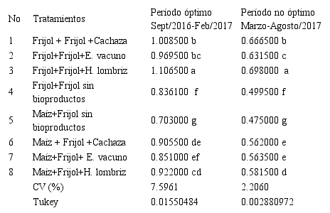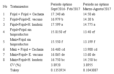 Este indicador manifiesta al T3 con la mayor media en ambos períodos experimentales, seguido por el T1, T2, T8, T6, T7, T4 y T5; respectivamente. Este último fue el de menor media estadística para ambos experimentos.