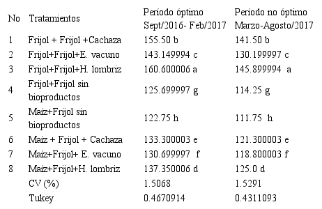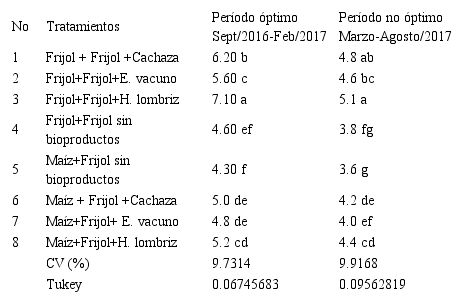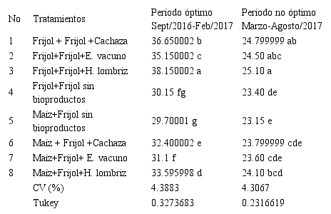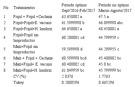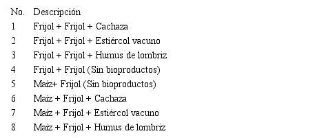 El experimento se realizó en condiciones de producción, en dos épocas de siembra, una en la campaña de frío, comprendida de septiembre/2016 a febrero/2017 (período óptimo), y otra en la campaña de primavera, comprendida de marzo a agosto/2017 (período no óptimo), con una distancia de siembra de 0.60 m de camellón por 0.10 m de narigón. Se utilizó la variedad de fríjol Delicia en rotación con el cultivo de maíz (Zea mays, L.), variedad Tuzón, bajo un diseño experimental totalmente aleatorizado con 8 tratamientos y cuatro réplicas. Los datos estadísticos para cada variable respuesta fueron evaluados mediante análisis de varianza de clasificación simple y comparación múltiple de medias mediante la prueba de Tukey al 1 %.