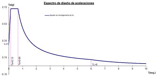 El espectro de diseño de aceleraciones obtenido, para un suelo tipo D (establecido para la zona de emplazamiento), se muestra en la figura 3.