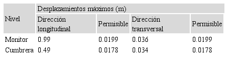 Al analizar los desplazamientos, se significa que los desplazamientos relativos, evaluados desde la base de la columna hasta su extremo superior, se encuentran en un rango aceptable y dentro de los valores permitidos por el código de diseño; no obstante, se aprecia que los desplazamientos máximos que se producen en el tope de la estructura, a la altura del monitor, son altos. Esta condición obedece a la falta de rigidez del sistema de cubierta. En la Tabla 5 se muestran los valores de desplazamientos máximos determinados en el tope de la estructura.