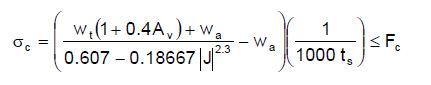[Ecuación 24.]Donde, Wt :Peso del tanque y la cubierta actuando en la base, Av:Parámetro sísmico de aceleración vertical del terreno, Mrw:Momento actuante en la base de la pared del tanque, D: Diámetro nominal del tanque, Ts: Espesor nominal de la base del tanque, sin corrosión, J: Proporción de anclaje, (ecuación 25).