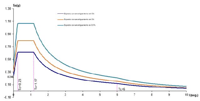 [Ecuación 18.]Para el análisis sísmico de tanques de acero es necesario obtener un espectro de aceleraciones para un amortiguamiento del 2 %, que se utiliza para la masa del líquido, considerada como impulsiva; de igual manera, se debe determinar el espectro de aceleraciones para un amortiguamiento del 0.5 %, que es utilizado para el resto de la masa del líquido llamada masa convectiva. Para obtener los espectros con amortiguamientos del 2 y 0.5 % se recomienda utilizar los factores de amplificación desarrollados por Newmark y Hall en 1982.
