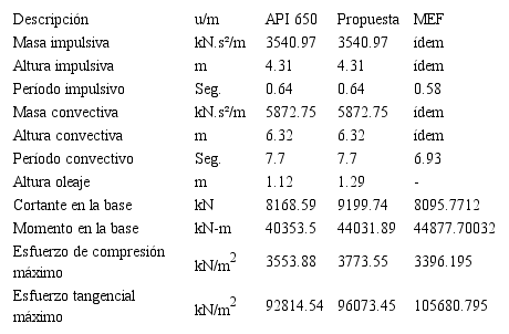 La tabla 2 muestra un resumen de los parámetros globales de comportamiento dinámico, como resultado de la aplicación de los procedimientos simplificados de diseño. También se muestran los resultados derivados del análisis del tanque objeto de estudio, basado en un modelo complejo, desarrollado mediante el método de los elementos finitos, con la ayuda del software profesional SAP 2000, en el cual se han introducido los valores de masas convectiva e impulsiva (ligada mediante resortes), a sus respectivas alturas.