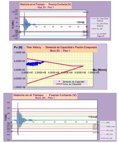Se comprueba de la historia del cortante que el valor límite del cortante admitido para este trabajo, por razones constructivas, para la necesidad de colocación de refuerzo diagonal es superado en 2 ciclos de cargas en toda la historia del evento (figura 3). Lo anterior corrobora la necesidad de reducción de estas altas solicitaciones de cortante en la viga, basada en una respuesta elasto-plástica de la estructura que garantice reducciones por ductilidad de las cargas sísmicas. Igualmente sucede para el muro B3 seleccionado, donde la respuesta supera casi para tres ciclos de cargas el cortante resistente total del muro, obtenida de la contribución de la mampostería y del acero dispuesto (figura 3).