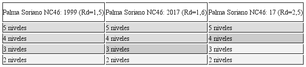 Se evalúa la influencia del cambio de norma sísmica, considerando la nueva norma sísmica NC 46 2017 (Cuba. Comité Estatal de Normalización, 2017), de lo cual resulta una discreta reducción de las demandas sísmicas horizontales, debido a que según este nuevo reglamento disminuye discretamente el peso sísmico (figura 1). La disminución del peso sísmico está condicionada por la consideración de un por ciento significativamente menor de cargas de utilización en la NC 46:2017, que actúan simultáneamente con las cargas de peso propio y cargas permanentes. Debe aclararse que la peligrosidad sísmica para la ciudad de Palma Soriano, por el cambio de reglamento, apenas se modifica en el caso de edificios soportados en bases de suelos rígidos (Perfil C). Un análisis comparativo similar en relación con las demandas sísmicas en edificios (coeficientes de amplificación dinámica de las aceleraciones del suelo) muestra que para edificios con períodos fundamentales de oscilación en el dominio de resonancia del suelo, como es el caso que nos ocupa, no resultan cambios significativos en estas demandas sísmicas. El valor algo menor del coeficiente sísmico horizontal obtenido para las variantes de edificios generadas de la aplicación del nuevo reglamento sísmico, se debe a que resulta una reducción por ductilidad algo mayor para edificios con comportamiento cuasi elástico.