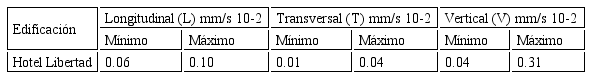 En Cuba, al no existir documentos normativos que limiten los valores de las vibraciones generadas por la circulación vehicular, se adoptan las normativas europeas, en las que los valores límites permisibles de las vibraciones están en dependencia del tipo de edificación y la frecuencia de las vibraciones, con mayor requerimiento para las edificaciones de alto valor patrimonial, las cuales plantean valores límites de velocidad de las vibraciones del orden de 1-3 mm/s. Este valor normado no fue superado en ninguno de los sitios estudiados, pero los valores espectrales sí superan este valor.