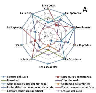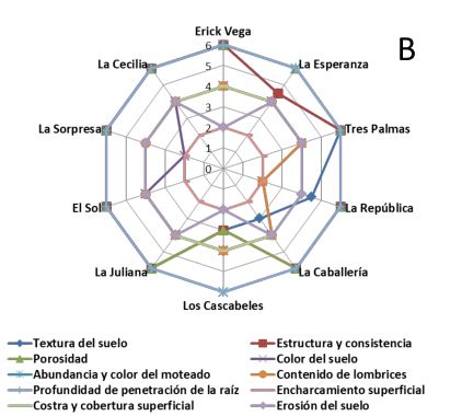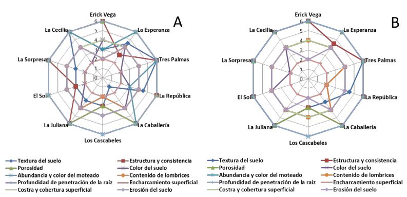 Por su parte, los resultados alcanzados en la presente investigación son similares a los reportados por Escobar et al. (2017) para las fincas La Esperanza, La Caballería, Los Cascabeles y La Sorpresa. Asimismo, señalaron que los indicadores que más incidieron en los resultados fueron textura, estructura y consistencia, porosidad, color y cantidad de lombrices. Los indicadores antes señalados incluyen a los reportados por Vargas et al. (2018) para el caso de la finca Los Cascabeles, aunque el índice de calidad visual obtenido por los autores referidos es ligeramente superior al alcanzado en esta investigación. No se debe olvidar que este predio productivo recibió influencia negativa de casi todos los indicadores de la calidad del suelo en ambos períodos.