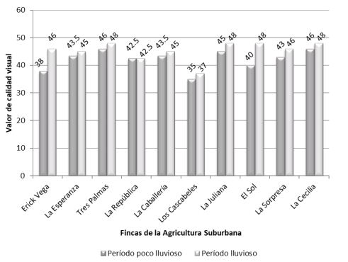 El índice de calidad visual del suelo (Figura 2) en todas las fincas tiende al aumento cuando se cambia de un período al otro, aunque numéricamente los cambios no son significativos, excepto en las fincas Erick Vega y El Sol, donde se aumentan ocho puntos de la escala. En el período poco lluvioso los mejores valores se presentaron en las fincas Tres Palma, La Cecilia y La Juliana; mientras que en el período lluvioso se mantienen estas tres y se le une la finca El Sol, en todos los casos, con el valor máximo que puede alcanzar este índice. En ambos períodos los menores valores de calidad del suelo se encontraron en Los Cascabeles. No obstante, de acuerdo con la escala referida en los Materiales y Métodos, en las dos temporadas la calidad del suelo desde el punto de vista visual se clasifica como buena al superar el valor de 30.