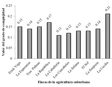 El grado de complejidad de las fincas objeto de estudio no fue muy variable cuando se comparan entre ellas (Figura 3). El mayor valor, en comparación con el resto, le correspondió a la finca La Cecilia con 0,21; en tanto, los menores valores les pertenecieron a La Caballería y Los Cascabeles, con 0,11 y 0,12 respectivamente. De forma general todas las fincas resultaron simplificadas respecto a este indicador, según la escala para su clasificación de acuerdo con la metodología utilizada.