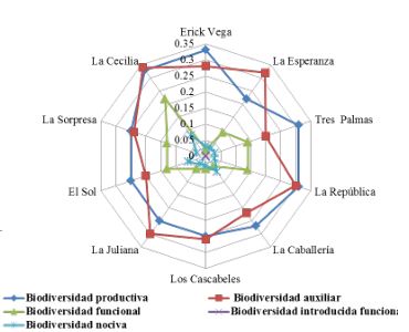 Todos los componentes de la biodiversidad mantuvieron un comportamiento similar (Figura 4). La biodiversidad productiva fue la variable que mayores valores alcanzó, en tanto la biodiversidad introducida funcional se mantuvo en 0 para todas las fincas estudiadas. De forma general los menores valores para cada componente se obtuvieron en la finca La Caballería, excepto para la biodiversidad funcional y la nociva, que se encontraron más bajos en Los Cascabeles, único predio productivo donde se obtuvo valores de 0 en dos de los componentes evaluados.