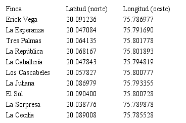 Finalmente, fueron escogidas las fincas Erick Vega, La Esperanza, Tres Palmas, La República, La Caballería, Los Cascabeles, La Juliana, El Sol, La Sorpresa y La Cecilia, al ser las que mayor cantidad de requisitos positivos acumularon. En la Tabla 1 aparecen las coordenadas de cada uno los sistemas productivos seleccionados. Dichos datos fueron determinados a partir de la utilización del Sistema de Información Geográfico MAPINFO, versión 9.0, y la herramienta digital Google Maps.