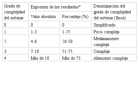 Para la determinación del grado de complejidad presente en cada una de las fincas objeto de estudio se procedió según la Metodología para la caracterización rápida de la diversidad biológica en las fincas, como base para el manejo agroecológico de plagas de Vázquez y Matienzo (2010). Esta metodología se basa en la consideración de cinco componentes fundamentales de la biodiversidad en fincas, los cuales están relacionados con: (i) Biodiversidad productiva, (ii) Biodiversidad nociva, (iii) Biodiversidad introducida funcional, (iv) Biodiversidad funcional y (v) Biodiversidad auxiliar. Dentro de cada uno de estos componentes son evaluados indicadores a los que, de acuerdo con el valor de campo que adquieren, sea absoluto o porcentual, les son atribuidos grados de complejidad según la siguiente escala: (Tabla 3)