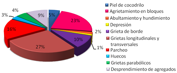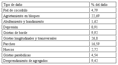 En la Tabla 1 y la Figura 2 aparecen los deterioros registrados durante la inspección visual efectuada a las 15 unidades de muestreo, así como el por ciento que representa cada uno de los daños de la cantidad total levantada.