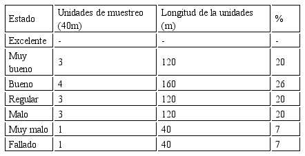 El análisis estadístico indica inspeccionar 14 unidades, cada una de las cuales abarca un área de pavimento igual a 250 m2. Se adiciona otra unidad por tratarse de una zona dentro del tramo donde el pavimento se encuentra en muy mal estado.