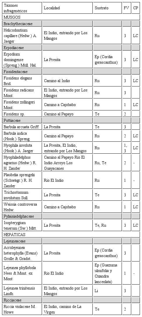 Leyenda: Sustrato: Ru: Rupícola, Te: Terrícola. Ct: Epífito, Li: Lignícola (madera podrida). 1: Bosque secundario en ecótopo de bosque de galería. 2: Matorral secundario en ecótopo de bosque semideciduo micrófilo. 3: Bosque semideciduo micrófilo. Categoría preliminar (CP): LC: Preocupación menor.