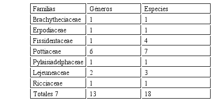 La familia más diversa es Pottiaceae (con siete especies), le continúa en orden decreciente Fissidentaceae (con cuatro) y Lejeuneaceae (con tres) (Tabla 2).