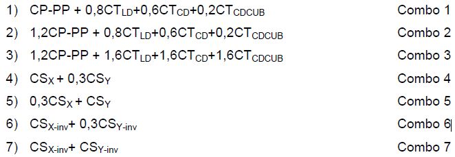 Las combinaciones de cargas de partida introducidas al SAP 2000NL, versión 19, para el posterior diseño estructural, con el libro Excel DISRESPLAS, son las que aparecen a continuación. Estas combinaciones son tratadas por separado por la plantilla de cálculo por ser de orígenes diferentes (cargas gravitatorias y cargas sísmicas), antes de combinarlas según lo especificado en la norma cubana NC 450:2006 para el diseño estructural (Cuba. Oficina Nacional de Normalización, 2006): Fig. 1