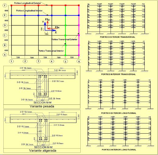 Los pórticos dúctiles de hormigón armado, para los cuales se realiza el diseño sismorresistente de sus secciones críticas, así como el diseño plástico ofrecido por el software DISRESPLAS de una de sus secciones para las dos variantes de edificio seleccionadas, se muestran en la figura 1