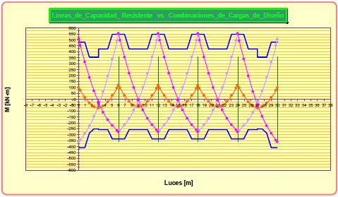 Los gráficos de solicitaciones de cálculo de momento flector resultan de las redistribuciones plásticas de las solicitaciones para combinaciones de cargas de diseño, que consideran una inversión de las acciones sísmicas. Estos gráficos permiten el cálculo del acero longitudinal en las secciones críticas de las vigas y la realización del despiezo del acero de refuerzo longitudinal. Antes de calcular el acero longitudinal de las vigas se verifica si las solicitaciones de momento flector para la combinación de cargas verticales máximas dominan en el diseño. Finalmente se construyen las “Líneas de Capacidad Resistente a Flexión”, que permiten, a través de la comparación con las solicitaciones de diseño, chequear la capacidad portante de las vigas y racionalizar el diseño a flexión (Figura 2). Según el diseño estructural a flexión de las vigas de las dos variantes, se demuestran reducciones de alrededor del 12 % (Tabla 2) del área de acero longitudinal en las vigas para la variante aligerada, conforme a la reducción que se apreció en las cargas sísmicas.