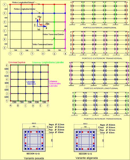 En la figura 3 aparecen los pórticos dúctiles de hormigón armado para los cuales se realiza el diseño sismorresistente de las secciones críticas de las columnas, previamente definidos los distintos grupos de columnas de acuerdo con su posición en la planta del edificio. En esta figura se muestra también, a modo de ejemplo, el diseño plástico ofrecido por el software DISRESPLAS de una de sus secciones para las dos variantes de edificio.
