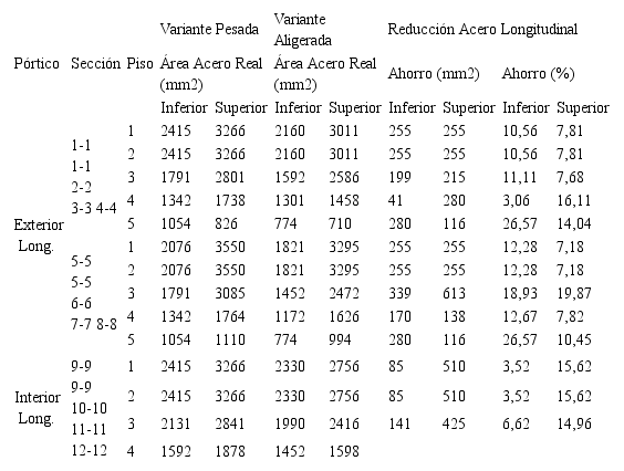 No obstante al incremento de las aceleraciones de respuestas para la variante aligerada por la disminución del período fundamental en las dos direcciones principales del edificio, se obtienen ahorros significativos en el acero longitudinal de vigas y columnas.