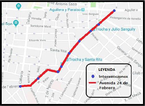 La Avenida 24 de Febrero es una de las arterias vehiculares más significativas de toda la ciudad de Santiago de Cuba. El tramo analizado se extiende desde Aguilera hasta Calvario. Tiene más de siglo y medio de existencia y desde su construcción ha sido un ícono de la capital oriental cubana. Ver figura 2.