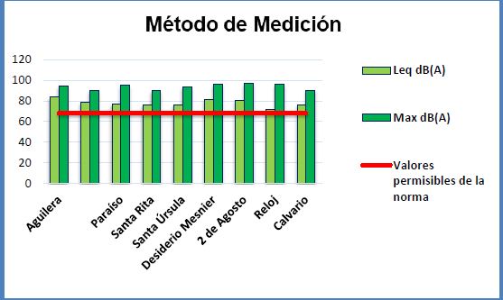 En todas las intersecciones los valores de ruido superan lo establecido por la Norma Cubana NC 26:2012 (Cuba. Oficina Nacional de Normalización, 2012).