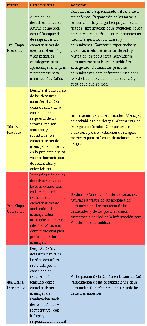 La dimensión incluye cuatro etapas del mensaje que pueden ser adaptadas según el contexto donde se apliquen. Todas las acciones tienen un carácter orientador y participativo. Las cuatro etapas de orientación del mensaje a la población se articulan con el Modelo Prospectivo para la Gestión Estratégica de Riesgos Naturales, publicado por Guasch (2018). (Ver Tabla 1)