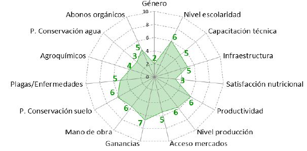 Los valores de menor respuesta (≤ 4 puntos) se concentran en la brecha de género (2 puntos), la satisfacción nutricional (3), las prácticas de conservación de agua (3) y el uso de agroquímicos (4). El primer caso se explica porque en el agroecosistema solo incide de manera directa el agricultor, mientras que su esposa y suegra se encargan de la atención al vivero de café, el huerto casero y las labores domésticas de la casa. Este mismo proceder se aprecia para la fuerza laboral femenina contratada, pues son ellas las que asumen las labores de menor remuneración y responsabilidad.