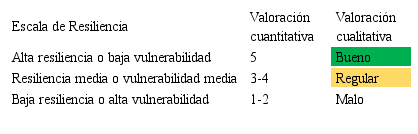 Para la determinación de la resiliencia de los agroecosistemas ante eventos climáticos extremos (tabla 2) se utilizó la siguiente escala de calificación (Henao 2013, p. 85-91):