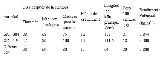 Los días para la floración después de la siembra (Tabla 3) en las variedades evaluadas mostraron diferencias significativas entre sí, correspondiendo la mayor media a la variedad CC-25-9, la cual superó a Delicias 364 y BAT 304 en ese propio orden, resultando esta última la media de menor valor.