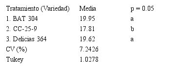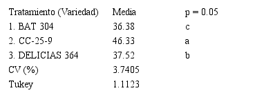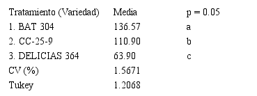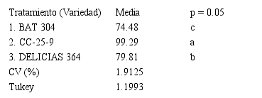 Los resultados evidencian, que no existieron diferencias estadísticas entre las variedades BAT 304 y DELICIAS 364. Sin embargo, ambas superaron significativamente a la variedad CC-25-9.
