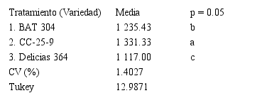 La mayor media correspondió a la variedad CC-25-9, la cual superó estadísticamente a las otras dos variedades.