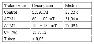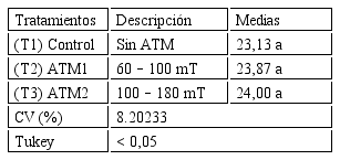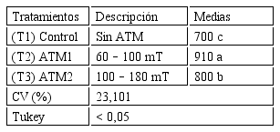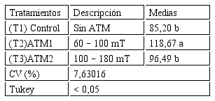 En la variable altura de la planta (Tabla 1) el control sin inducción magnética (T1) obtuvo la menor media aunque sin diferencia estadística con respecto a T3 (ATM2:100–180 mT), pero ambos fueron superados significativamente por T2 (ATM1: 60–100 mT).