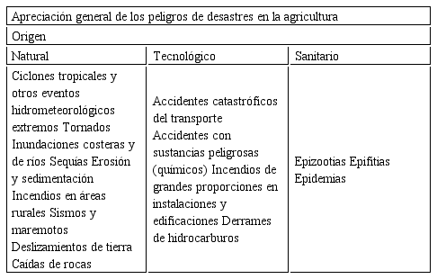 En la actualidad en nuestro país se están ejecutando los estudios de peligro, vulnerabilidad y riesgo de desastres indicados en la Directiva No. 1 del Presidente del Consejo de Defensa Nacional para la reducción de desastres (Cuba. Estado Mayor Nacional de la Defensa Civil), coordinados por la Delegación Territorial del Citma. El sector agrícola se encuentra reflejado en esta directiva, puesto que se estudian las zonas de peligro, los elementos que pueden constituir vulnerabilidades y se evalúa la magnitud del riesgo a que se encuentran expuestas las diferentes infraestructuras y la población rural; además, constituye una herramienta en manos de los decisores con el objetivo de optimizar los recursos disponibles.