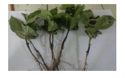 Los primeros síntomas de Fusarium oxysporum en el cultivo del café (Coffea arabica var Isla F6-14) se manifestaron como necrosis en la base de los tallos, que muestran una mancha café oscuro con fisuras longitudinales que provocan un fácil desprendimiento de la epidermis de la raíz. Esto induce a un marchitamiento de las posturas y luego a la muerte de la planta. (Figura 1).